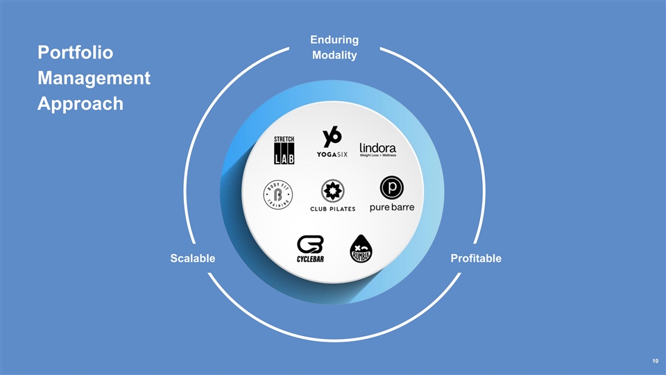 COMPANY HIGHLIGHTS SYSTEM-WIDE Club Pilates 10% SALES 5% (1) $1.7B+ System-Wide Sales (4) BY BRAND StretchLab (1) 13% $318M Revenue Pure Barre 57% (1)(2) YogaSix $114M Adj. EBITDA 15% All Other Brands (3) 850K+ Members (3) 2017 2021 2025 Xponential Fitness IPO on NYSE (XPOF) Total Studios 3,298 Founded 1. LTM as of 3/31/25. 2. Adj. EBITDA is a non-GAAP financial measure. See appendix for reconciliation to net loss, the most directly comparable GAAP financial measure. 3. As of 3/31/25. 4. Based on 2024 Actuals. 9