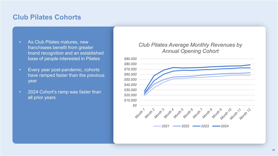 Club Pilates Cohorts • As Club Pilates matures, new Club Pilates Average Monthly Revenues by franchisees benefit from greater Annual Opening Cohort brand recognition and an established base of people interested in Pilates $90,000 $80,000 $70,000 • Every year post-pandemic, cohorts $60,000 have ramped faster than the previous $50,000 year $40,000 $30,000 • 2024 Cohort’s ramp was faster than $20,000 all prior years $10,000 $0 2021 2022 2023 2024 17