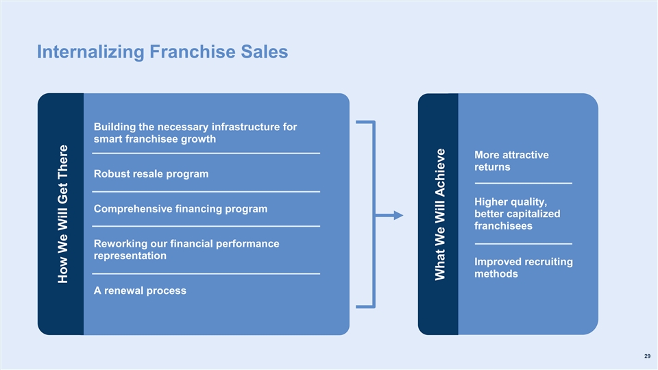 Internalizing Franchise Sales Building the necessary infrastructure for smart franchisee growth More attractive returns Robust resale program Higher quality, Comprehensive financing program better capitalized franchisees Reworking our financial performance representation Improved recruiting methods A renewal process 29 How We Will Get There What We Will Achieve