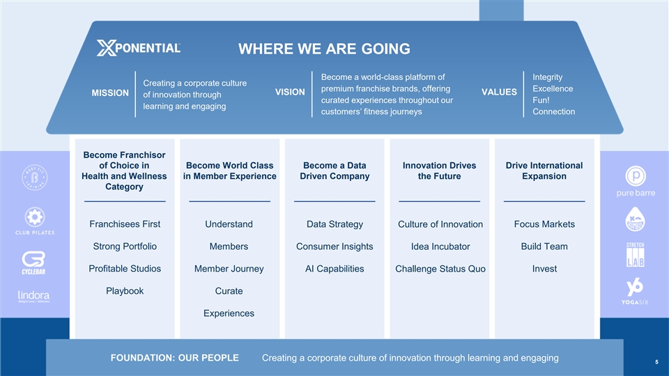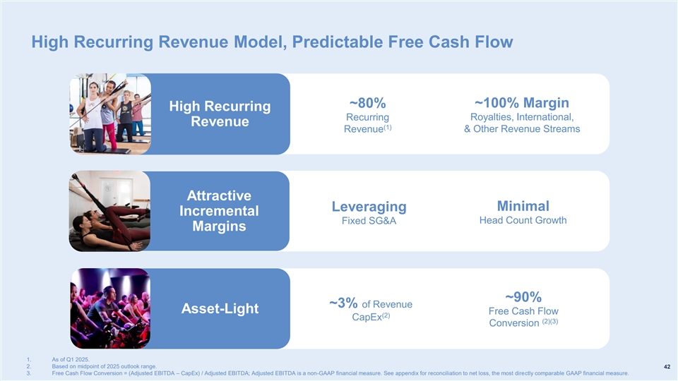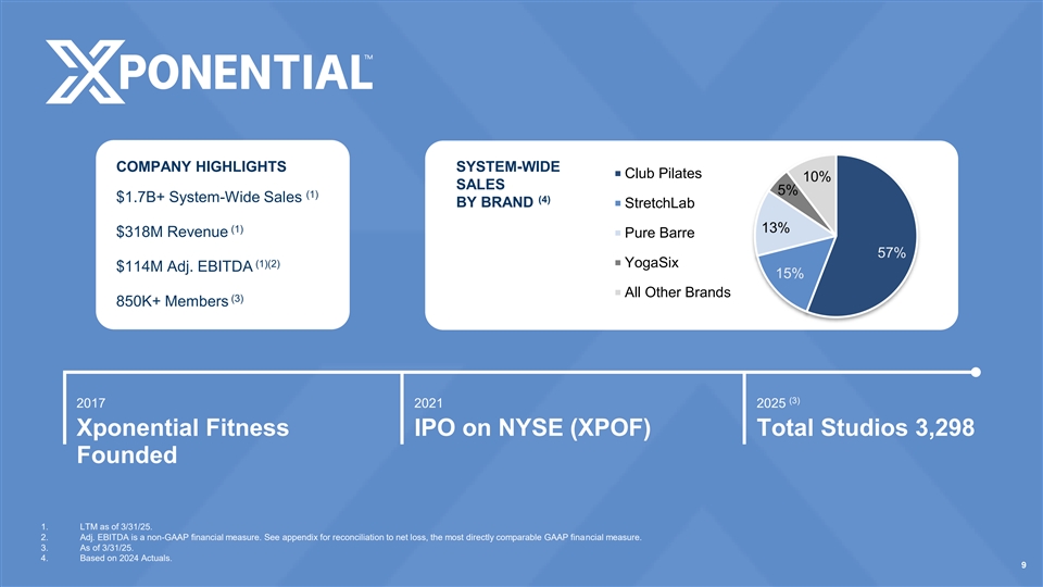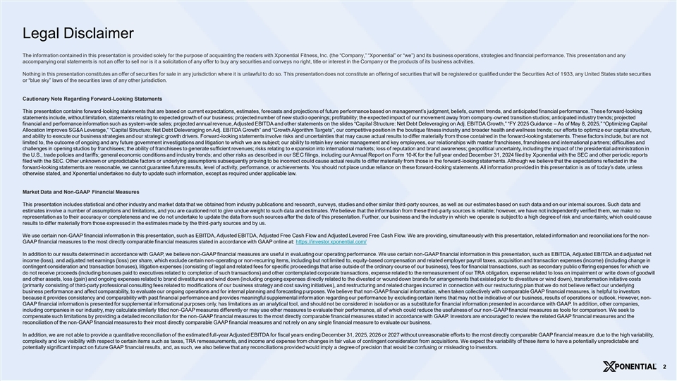 Legal Disclaimer The information contained in this presentation is provided solely for the purpose of acquainting the readers with Xponential Fitness, Inc. (the “Company,” “Xponential” or “we”) and its business operations, strategies and financial performance. This presentation and any accompanying oral statements is not an offer to sell nor is it a solicitation of any offer to buy any securities and conveys no right, title or interest in the Company or the products of its business activities. Nothing in this presentation constitutes an offer of securities for sale in any jurisdiction where it is unlawful to do so. This presentation does not constitute an offering of securities that will be registered or qualified under the Securities Act of 1933, any United States state securities or “blue sky” laws of the securities laws of any other jurisdiction. Cautionary Note Regarding Forward-Looking Statements This presentation contains forward-looking statements that are based on current expectations, estimates, forecasts and projections of future performance based on management’s judgment, beliefs, current trends, and anticipated financial performance. These forward-looking statements include, without limitation, statements relating to expected growth of our business; projected number of new studio openings; profitability; the expected impact of our movement away from company-owned transition studios; anticipated industry trends; projected financial and performance information such as system-wide sales; projected annual revenue, Adjusted EBITDA and other statements on the slides “Capital Structure: Net Debt Deleveraging on Adj. EBITDA Growth,” “FY 2025 Guidance – As of May 8, 2025,” “Optimizing Capital Allocation Improves SG&A Leverage,” “Capital Structure: Net Debt Deleveraging on Adj. EBITDA Growth” and “Growth Algorithm Targets”, our competitive position in the boutique fitness industry and broader health and wellness trends; our efforts to optimize our capital structure, and ability to execute our business strategies and our strategic growth drivers. Forward-looking statements involve risks and uncertainties that may cause actual results to differ materially from those contained in the forward-looking statements. These factors include, but are not limited to, the outcome of ongoing and any future government investigations and litigation to which we are subject; our ability to retain key senior management and key employees, our relationships with master franchisees, franchisees and international partners; difficulties and challenges in opening studios by franchisees; the ability of franchisees to generate sufficient revenues; risks relating to expansion into international markets; loss of reputation and brand awareness; geopolitical uncertainty, including the impact of the presidential administration in the U.S., trade policies and tariffs; general economic conditions and industry trends; and other risks as described in our SEC filings, including our Annual Report on Form 10-K for the full year ended December 31, 2024 filed by Xponential with the SEC and other periodic reports filed with the SEC. Other unknown or unpredictable factors or underlying assumptions subsequently proving to be incorrect could cause actual results to differ materially from those in the forward-looking statements. Although we believe that the expectations reflected in the forward-looking statements are reasonable, we cannot guarantee future results, level of activity, performance, or achievements. You should not place undue reliance on these forward-looking statements. All information provided in this presentation is as of today’s date, unless otherwise stated, and Xponential undertakes no duty to update such information, except as required under applicable law. Market Data and Non-GAAP Financial Measures This presentation includes statistical and other industry and market data that we obtained from industry publications and research, surveys, studies and other similar third-party sources, as well as our estimates based on such data and on our internal sources. Such data and estimates involve a number of assumptions and limitations, and you are cautioned not to give undue weight to such data and estimates. We believe that the information from these third-party sources is reliable; however, we have not independently verified them, we make no representation as to their accuracy or completeness and we do not undertake to update the data from such sources after the date of this presentation. Further, our business and the industry in which we operate is subject to a high degree of risk and uncertainty, which could cause results to differ materially from those expressed in the estimates made by the third-party sources and by us. We use certain non-GAAP financial information in this presentation, such as EBITDA, Adjusted EBITDA, Adjusted Free Cash Flow and Adjusted Levered Free Cash Flow. We are providing, simultaneously with this presentation, related information and reconciliations for the non- GAAP financial measures to the most directly comparable financial measures stated in accordance with GAAP online at: https://investor.xponential.com/ In addition to our results determined in accordance with GAAP, we believe non-GAAP financial measures are useful in evaluating our operating performance. We use certain non-GAAP financial information in this presentation, such as EBITDA, Adjusted EBITDA and adjusted net income (loss), and adjusted net earnings (loss) per share, which exclude certain non-operating or non-recurring items, including but not limited to, equity-based compensation and related employer payroll taxes, acquisition and transaction expenses (income) (including change in contingent consideration and transaction bonuses), litigation expenses (consisting of legal and related fees for specific proceedings that arise outside of the ordinary course of our business), fees for f