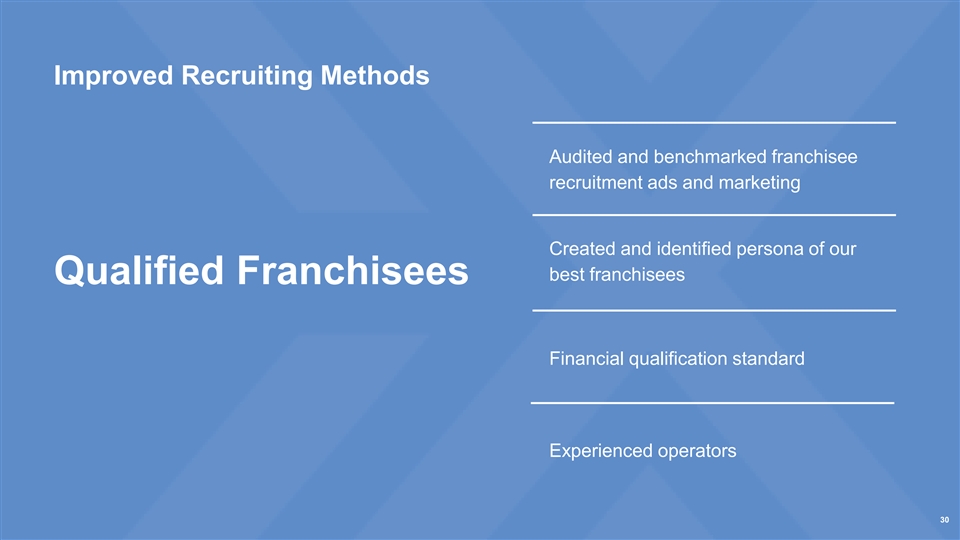 Improved Recruiting Methods Audited and benchmarked franchisee recruitment ads and marketing Created and identified persona of our best franchisees Qualified Franchisees Financial qualification standard Experienced operators 30