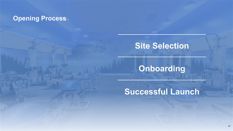 Franchisee Lifecycle STAGE 1 Selection Process STAGE 2 Studio Buildout and Opening STAGE 3 Ongoing Operations Renewal, Exit, Resale STAGE 4 28