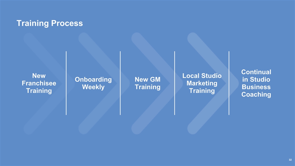 Training Process Continual New Local Studio Onboarding New GM in Studio Franchisee Marketing Weekly Training Business Training Training Coaching 32