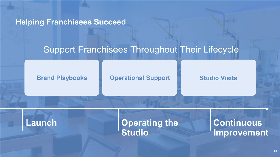 Helping Franchisees Succeed Support Franchisees Throughout Their Lifecycle Brand Playbooks Operational Support Studio Visits Launch Operating the Continuous Studio Improvement 33