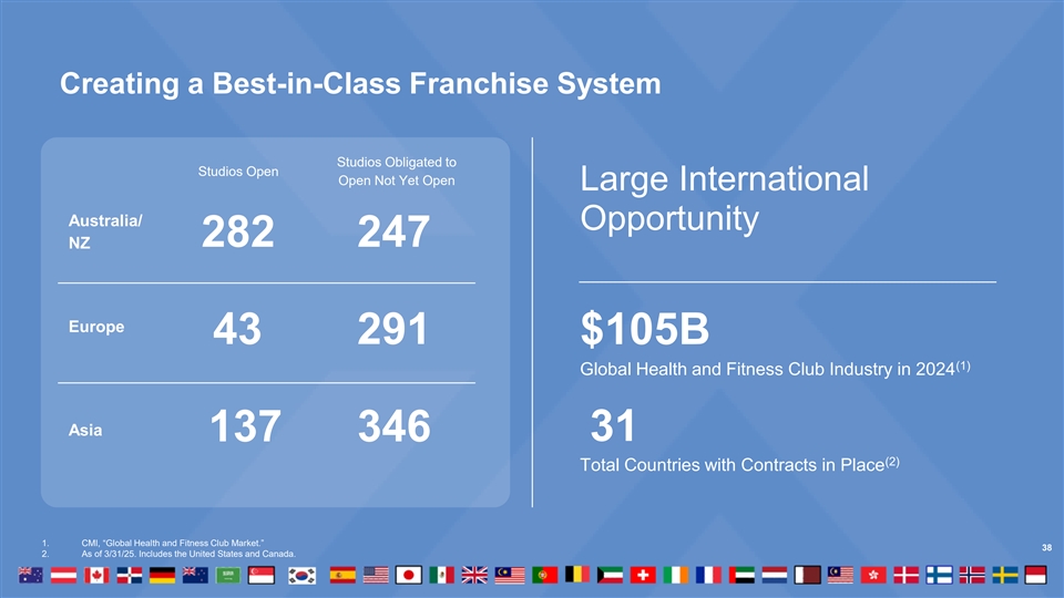 Creating a Best-in-Class Franchise System Studios Obligated to Studios Open Open Not Yet Open Large International Australia/ Opportunity 282 247 NZ Europe 43 291 $105B (1) Global Health and Fitness Club Industry in 2024 Asia 137 346 31 (2) Total Countries with Contracts in Place 1. CMI, “Global Health and Fitness Club Market.” 38 2. As of 3/31/25. Includes the United States and Canada.