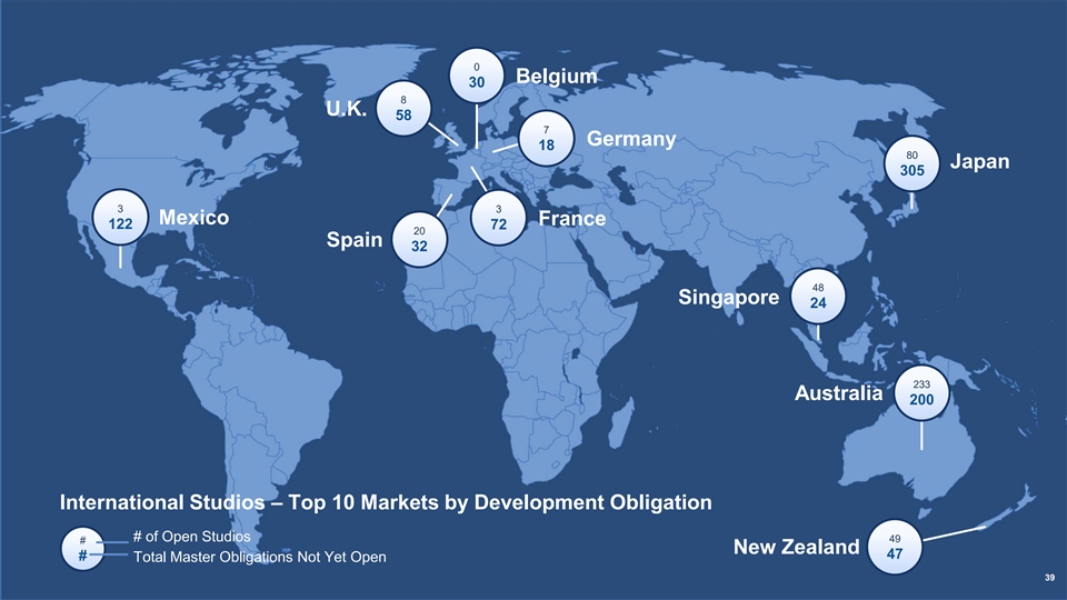 0 Belgium 30 8 U.K. 58 7 Germany 18 80 Japan 305 3 3 Mexico France 122 72 20 Spain 32 48 Singapore 24 233 Australia 200 International Studios – Top 10 Markets by Development Obligation # of Open Studios 49 # New Zealand 47 # Total Master Obligations Not Yet Open 39