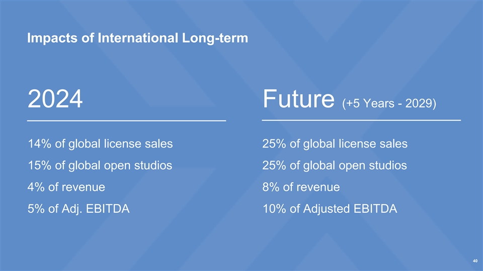 Impacts of International Long-term 2024 Future (+5 Years - 2029) 14% of global license sales 25% of global license sales 15% of global open studios 25% of global open studios 4% of revenue 8% of revenue 5% of Adj. EBITDA 10% of Adjusted EBITDA 40