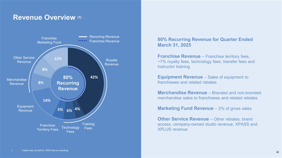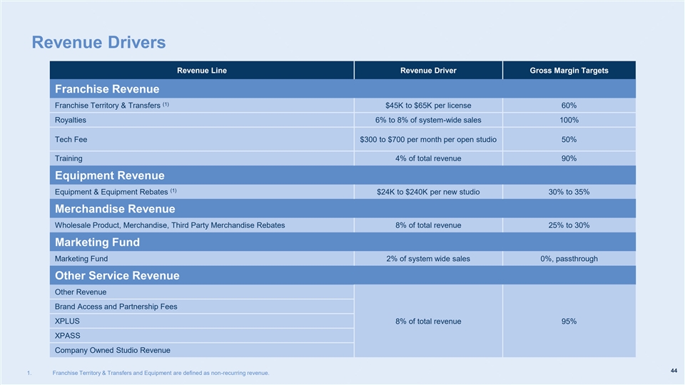 (1) Revenue Overview Recurring Revenue Franchise 80% Recurring Revenue for Quarter Ended Franchise Revenue Marketing Fund March 31, 2025 Franchise Revenue – Franchise territory fees, Other Service 12% Royalty Revenue ~7% royalty fees, technology fees, transfer fees and Revenue instructor training 8% 42% Equipment Revenue – Sales of equipment to 80% Merchandise 8% franchisees and related rebates Recurring Revenue Revenue Merchandise Revenue – Branded and non-branded merchandise sales to franchisees and related rebates 14% Equipment Marketing Fund Revenue – 2% of gross sales 4% 5% Revenue 6% Other Service Revenue – Other rebates, brand Training access, company-owned studio revenue, XPASS and Franchise Technology Fees Territory Fees XPLUS revenue Fees 1. Totals may not add to 100% due to rounding. 43