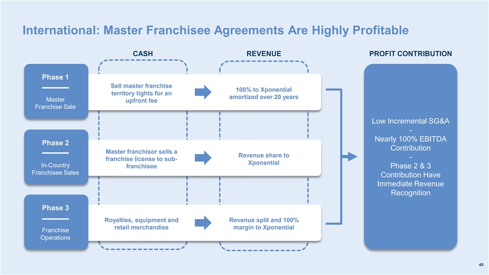 International: Master Franchisee Agreements Are Highly Profitable CASH REVENUE PROFIT CONTRIBUTION Phase 1 Sell master franchise 100% to Xponential territory tights for an amortized over 20 years Master upfront fee Franchise Sale Low Incremental SG&A - Nearly 100% EBITDA Phase 2 Contribution Master franchisor sells a Revenue share to - franchise license to sub- Xponential In-Country franchisee Phase 2 & 3 Franchisee Sales Contribution Have Immediate Revenue Recognition Phase 3 Royalties, equipment and Revenue split and 100% retail merchandise margin to Xponential Franchise Operations 45