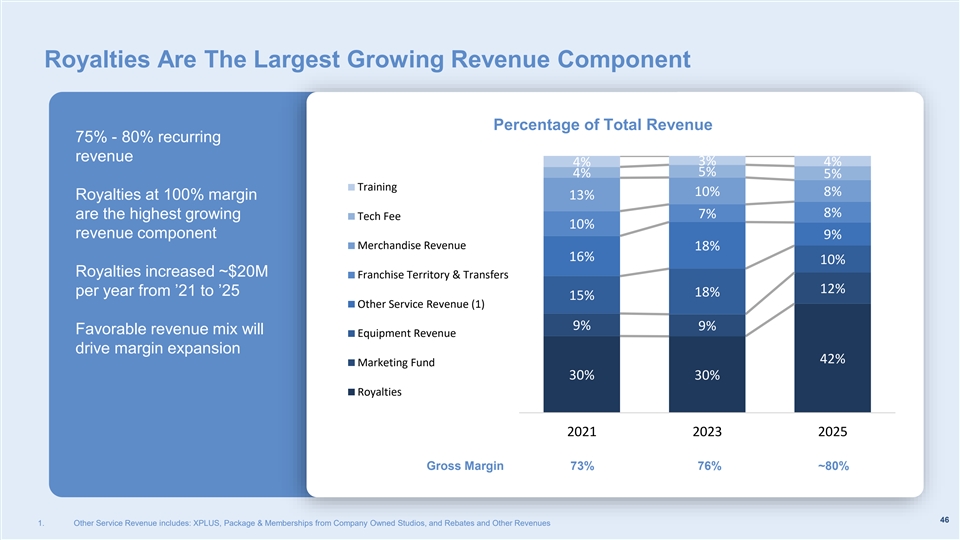 Royalties Are The Largest Growing Revenue Component Percentage of Total Revenue 75% - 80% recurring revenue 3% 4% 4% 5% 4% 5% Training 10% 8% Royalties at 100% margin 13% 8% are the highest growing 7% Tech Fee 10% revenue component 9% Merchandise Revenue 18% 16% 10% Royalties increased ~$20M Franchise Territory & Transfers 12% per year from ’21 to ’25 18% 15% Other Service Revenue (1) 9% 9% Favorable revenue mix will Equipment Revenue drive margin expansion 42% Marketing Fund 30% 30% Royalties 2021 2023 2025 Gross Margin 73% 76% ~80% 46 1. Other Service Revenue includes: XPLUS, Package & Memberships from Company Owned Studios, and Rebates and Other Revenues
