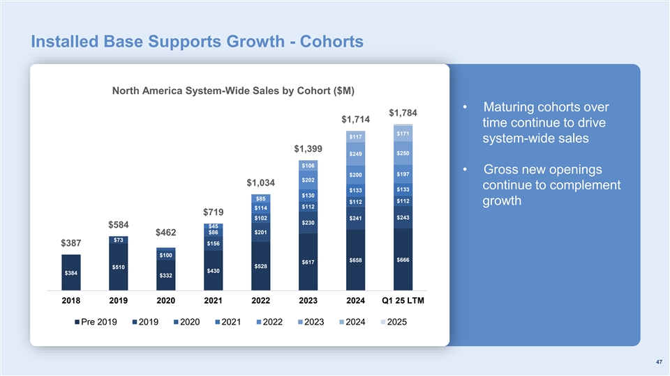 Installed Base Supports Growth - Cohorts North America System-Wide Sales by Cohort ($M) • Maturing cohorts over $1,784 $1,714 time continue to drive $171 $117 system-wide sales $1,399 $250 $249 $106 • Gross new openings $197 $200 $202 $1,034 continue to complement $133 $133 $130 $85 $112 $112 growth $112 $114 $719 $102 $241 $243 $230 $584 $45 $86 $201 $462 $73 $387 $156 $28 $100 $666 $658 $617 $528 $510 $430 $384 $332 2018 2019 2020 2021 2022 2023 2024 Q1 25 LTM Pre 2019 2019 2020 2021 2022 2023 2024 2025 47
