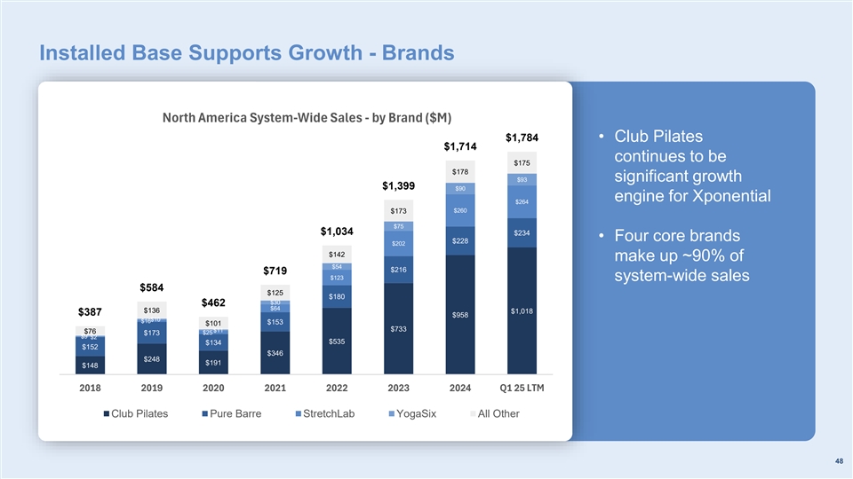 Installed Base Supports Growth - Brands North America System-Wide Sales - by Brand ($M) $1,784 • Club Pilates $1,714 continues to be $175 $178 $93 significant growth $1,399 $90 engine for Xponential $264 $260 $173 $75 $1,034 $234 • Four core brands $228 $202 $142 make up ~90% of $54 $216 $719 $123 system-wide sales $584 $125 $180 $30 $462 $64 $136 $1,018 $387 $958 $10 $16 $153 $101 $733 $11 $76 $25 $173 $9 $2 $535 $134 $152 $346 $248 $191 $148 2018 2019 2020 2021 2022 2023 2024 Q1 25 LTM Club Pilates Pure Barre StretchLab YogaSix All Other 48