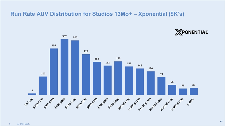 Run Rate AUV Distribution for Studios 13Mo+ – Xponential ($K’s) 307 300 256 224 185 183 162 157 146 130 102 99 56 39 36 9 49 1. As of Q1 2025.