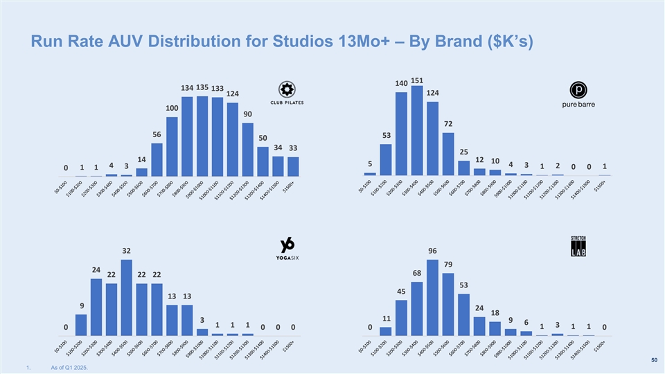 Run Rate AUV Distribution for Studios 13Mo+ – By Brand ($K’s) 151 140 135 134 133 124 124 100 90 72 56 53 50 34 33 25 14 12 10 5 4 4 3 2 3 1 1 1 1 0 0 0 32 96 79 24 68 22 22 22 53 45 13 13 9 24 18 11 3 9 6 1 1 1 3 1 1 1 0 0 0 0 0 0 50 1. As of Q1 2025.