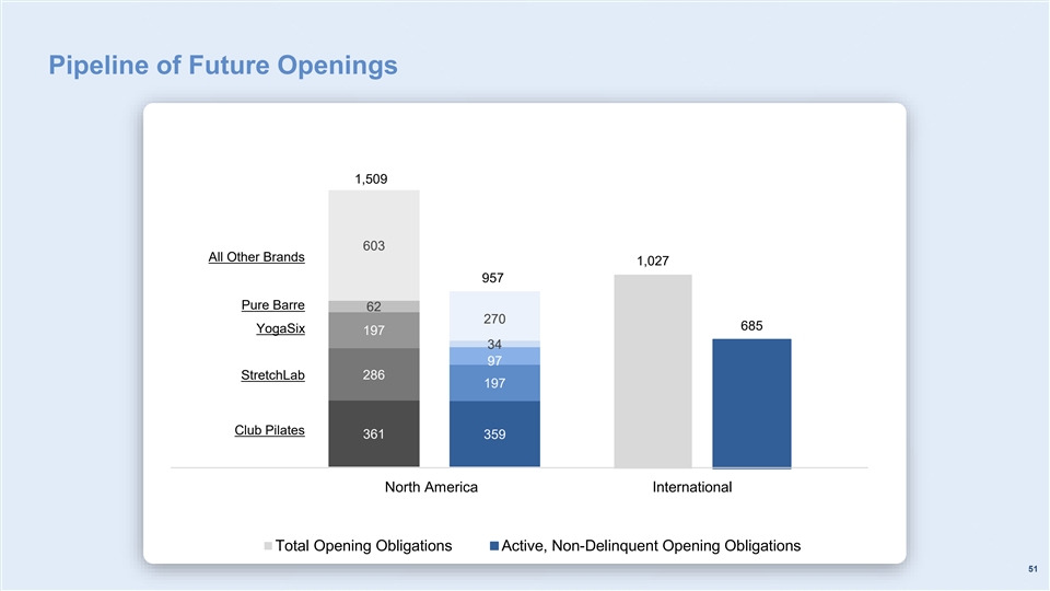 Pipeline of Future Openings 1,509 603 All Other Brands 1,027 All Other Brands 957 957 Pure Barre Pure Barre 62 270 YogaSix 685 YogaSix 197 StretchLab 34 97 Club Pilates StretchLab 286 197 Club Pilates 361 359 North America International Total Opening Obligations Active, Non-Delinquent Opening Obligations 51