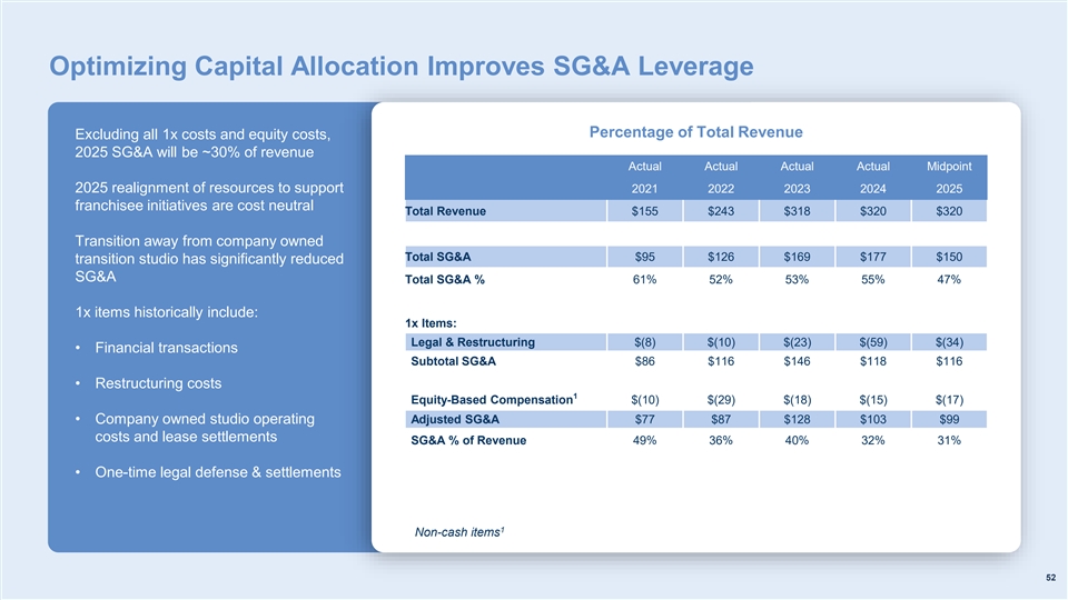 Optimizing Capital Allocation Improves SG&A Leverage Percentage of Total Revenue Excluding all 1x costs and equity costs, 2025 SG&A will be ~30% of revenue Actual Actual Actual Actual Midpoint 2025 realignment of resources to support 2021 2022 2023 2024 2025 franchisee initiatives are cost neutral Total Revenue $155 $243 $318 $320 $320 Transition away from company owned Total SG&A $95 $126 $169 $177 $150 transition studio has significantly reduced SG&A Total SG&A % 61% 52% 53% 55% 47% 1x items historically include: 1x Items: Legal & Restructuring $(8) $(10) $(23) $(59) $(34) • Financial transactions Subtotal SG&A $86 $116 $146 $118 $116 • Restructuring costs 1 Equity-Based Compensation $(10) $(29) $(18) $(15) $(17) • Company owned studio operating Adjusted SG&A $77 $87 $128 $103 $99 costs and lease settlements SG&A % of Revenue 49% 36% 40% 32% 31% • One-time legal defense & settlements 1 Non-cash items 52
