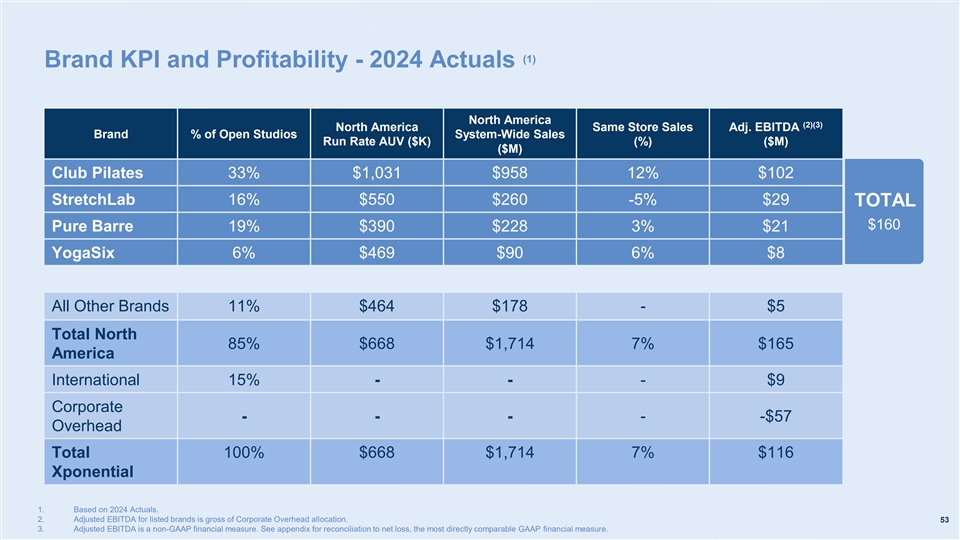 (1) Brand KPI and Profitability - 2024 Actuals North America (2)(3) North America Same Store Sales Adj. EBITDA Brand % of Open Studios System-Wide Sales Run Rate AUV ($K) (%) ($M) ($M) Club Pilates 33% $1,031 $958 12% $102 StretchLab 16% $550 $260 -5% $29 TOTAL $160 Pure Barre 19% $390 $228 3% $21 YogaSix 6% $469 $90 6% $8 All Other Brands 11% $464 $178 - $5 Total North 85% $668 $1,714 7% $165 America International 15% - - - $9 Corporate - - - - -$57 Overhead Total 100% $668 $1,714 7% $116 Xponential 1. Based on 2024 Actuals. 2. Adjusted EBITDA for listed brands is gross of Corporate Overhead allocation. 53 3. Adjusted EBITDA is a non-GAAP financial measure. See appendix for reconciliation to net loss, the most directly comparable GAAP financial measure.