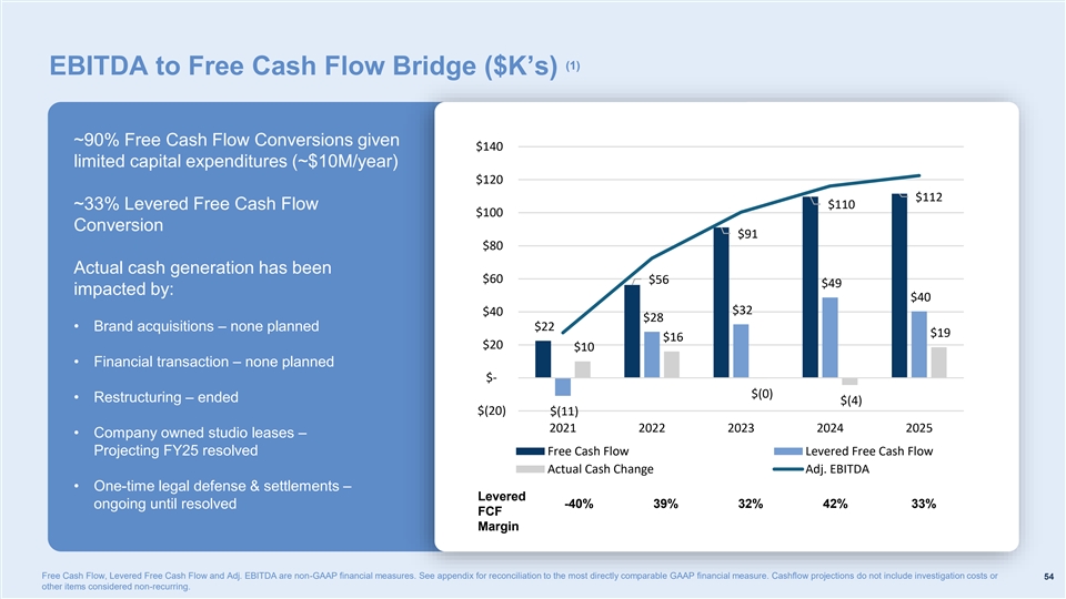 (1) EBITDA to Free Cash Flow Bridge ($K’s) ~90% Free Cash Flow Conversions given $140 limited capital expenditures (~$10M/year) $120 $112 $110 ~33% Levered Free Cash Flow $100 Conversion $91 $80 Actual cash generation has been $60 $56 $49 impacted by: $40 $32 $40 $28 • Brand acquisitions – none planned $22 $19 $16 $20 $10 • Financial transaction – none planned $- $(0) • Restructuring – ended $(4) $(20) $(11) 2021 2022 2023 2024 2025 • Company owned studio leases – Projecting FY25 resolved Free Cash Flow Levered Free Cash Flow Actual Cash Change Adj. EBITDA • One-time legal defense & settlements – Levered ongoing until resolved -40% 39% 32% 42% 33% FCF Margin Free Cash Flow, Levered Free Cash Flow and Adj. EBITDA are non-GAAP financial measures. See appendix for reconciliation to the most directly comparable GAAP financial measure. Cashflow projections do not include investigation costs or 54 other items considered non-recurring.