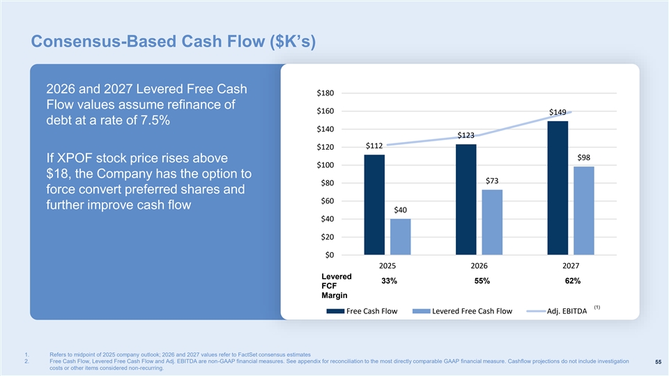 Consensus-Based Cash Flow ($K’s) 2026 and 2027 Levered Free Cash $180 Flow values assume refinance of $160 $149 debt at a rate of 7.5% $140 $123 $112 $120 $98 If XPOF stock price rises above $100 $18, the Company has the option to $73 $80 force convert preferred shares and $60 further improve cash flow $40 $40 $20 $0 2025 2026 2027 Levered 33% 55% 62% FCF Margin (1) Free Cash Flow Levered Free Cash Flow Adj. EBITDA(1) 1. Refers to midpoint of 2025 company outlook; 2026 and 2027 values refer to FactSet consensus estimates 2. Free Cash Flow, Levered Free Cash Flow and Adj. EBITDA are non-GAAP financial measures. See appendix for reconciliation to the most directly comparable GAAP financial measure. Cashflow projections do not include investigation 55 costs or other items considered non-recurring.