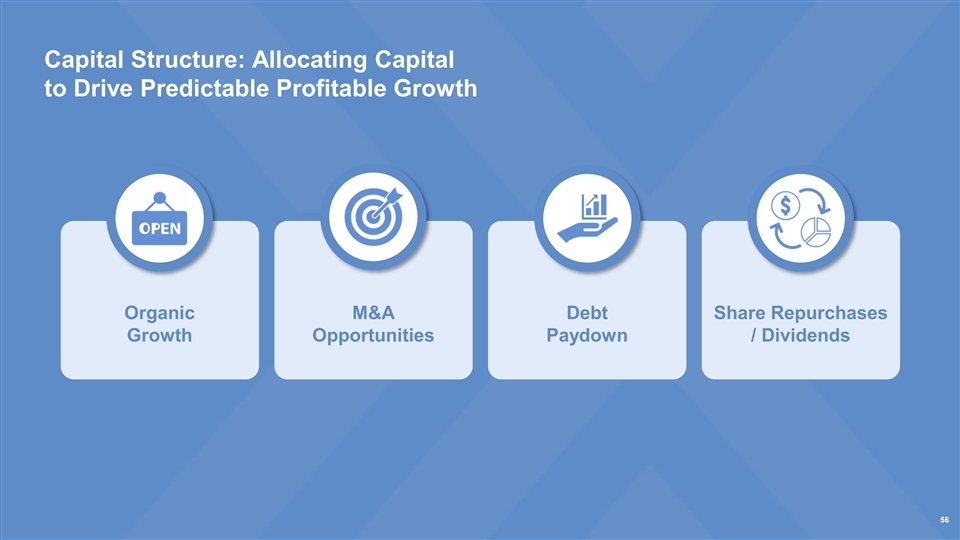 Capital Structure: Allocating Capital to Drive Predictable Profitable Growth Organic M&A Debt Share Repurchases Growth Opportunities Paydown / Dividends 56