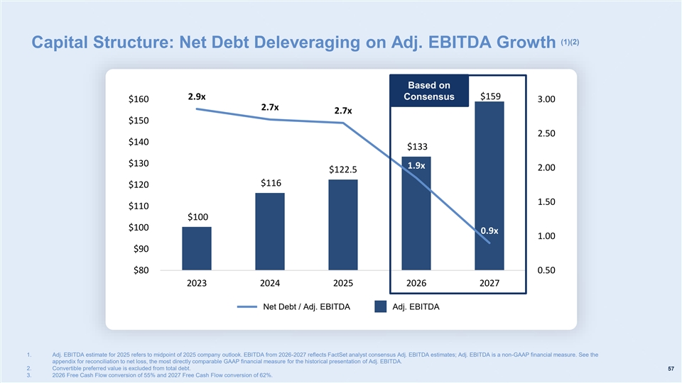 (1)(2) Capital Structure: Net Debt Deleveraging on Adj. EBITDA Growth Based on $159 2.9x Consensus $160 3.00 2.7x 2.7x $150 2.50 $140 $133 $130 1.9x 2.00 $122.5 $116 $120 1.50 $110 $100 $100 0.9x 1.00 $90 $80 0.50 2023 2024 2025 2026 2027 Net Debt / Adj. EBITDA Adj. EBITDA 1. Adj. EBITDA estimate for 2025 refers to midpoint of 2025 company outlook. EBITDA from 2026-2027 reflects FactSet analyst consensus Adj. EBITDA estimates; Adj. EBITDA is a non-GAAP financial measure. See the appendix for reconciliation to net loss, the most directly comparable GAAP financial measure for the historical presentation of Adj. EBITDA. 2. Convertible preferred value is excluded from total debt. 57 3. 2026 Free Cash Flow conversion of 55% and 2027 Free Cash Flow conversion of 62%.