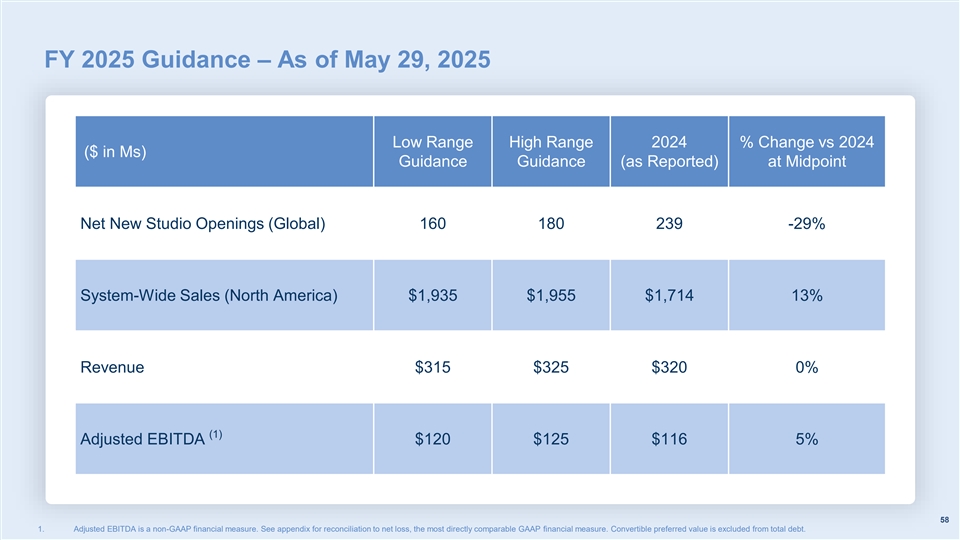 FY 2025 Guidance – As of May 29, 2025 Low Range High Range 2024 % Change vs 2024 ($ in Ms) Guidance Guidance (as Reported) at Midpoint Net New Studio Openings (Global) 160 180 239 -29% System-Wide Sales (North America) $1,935 $1,955 $1,714 13% Revenue $315 $325 $320 0% (1) Adjusted EBITDA $120 $125 $116 5% 58 1. Adjusted EBITDA is a non-GAAP financial measure. See appendix for reconciliation to net loss, the most directly comparable GAAP financial measure. Convertible preferred value is excluded from total debt.