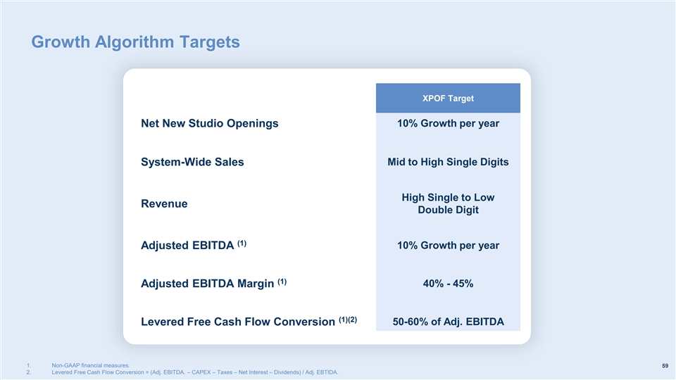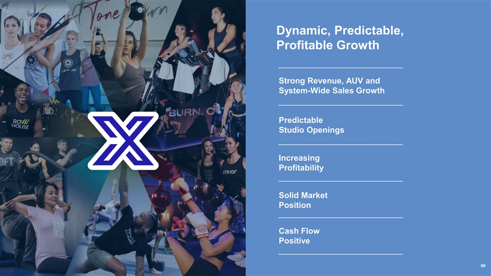 Growth Algorithm Targets XPOF Target 10% Growth per year Net New Studio Openings Mid to High Single Digits System-Wide Sales High Single to Low Revenue Double Digit (1) 10% Growth per year Adjusted EBITDA (1) Adjusted EBITDA Margin 40% - 45% (1)(2) Levered Free Cash Flow Conversion 50-60% of Adj. EBITDA 1. Non-GAAP financial measures. 59 2. Levered Free Cash Flow Conversion = (Adj. EBITDA. – CAPEX – Taxes – Net Interest – Dividends) / Adj. EBTIDA.