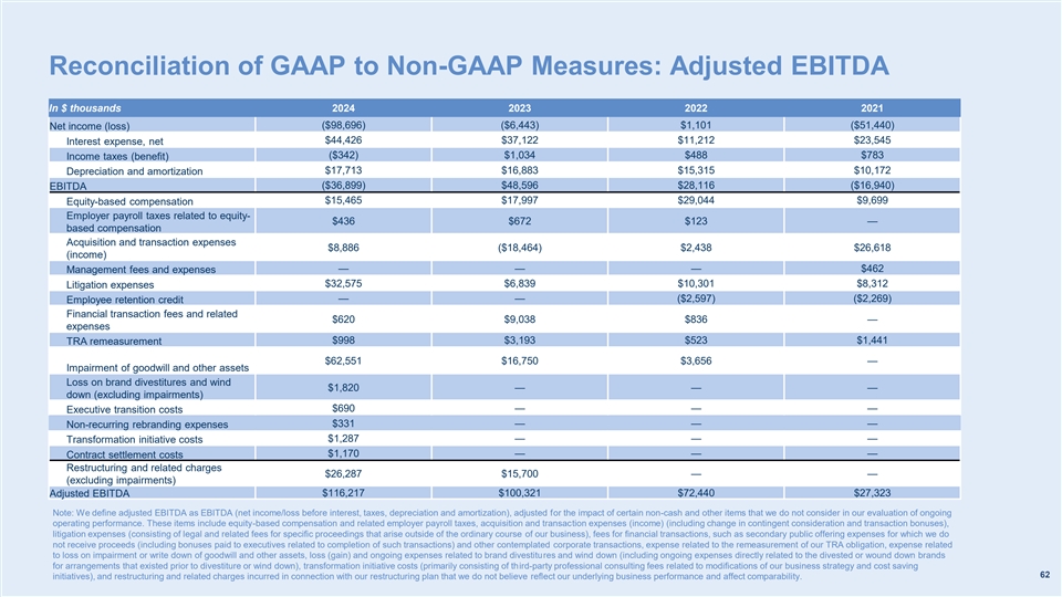 Reconciliation of GAAP to Non-GAAP Measures: Adjusted EBITDA In $ thousands 2024 2023 2022 2021 ($98,696) ($6,443) $1,101 ($51,440) Net income (loss) Interest expense, net $44,426 $37,122 $11,212 $23,545 ($342) $1,034 $488 $783 Income taxes (benefit) $17,713 $16,883 $15,315 $10,172 Depreciation and amortization ($36,899) $48,596 $28,116 ($16,940) EBITDA $15,465 $17,997 $29,044 $9,699 Equity-based compensation Employer payroll taxes related to equity- $436 $672 $123 — based compensation Acquisition and transaction expenses $8,886 ($18,464) $2,438 $26,618 (income) — — — $462 Management fees and expenses $32,575 $6,839 $10,301 $8,312 Litigation expenses — — ($2,597) ($2,269) Employee retention credit Financial transaction fees and related $620 $9,038 $836 — expenses $998 $3,193 $523 $1,441 TRA remeasurement $62,551 $16,750 $3,656 — Impairment of goodwill and other assets Loss on brand divestitures and wind $1,820 — — — down (excluding impairments) Executive transition costs $690 — — — $331 — — — Non-recurring rebranding expenses $1,287 — — — Transformation initiative costs $1,170 — — — Contract settlement costs Restructuring and related charges $26,287 $15,700 — — (excluding impairments) Adjusted EBITDA $116,217 $100,321 $72,440 $27,323 Note: We define adjusted EBITDA as EBITDA (net income/loss before interest, taxes, depreciation and amortization), adjusted for the impact of certain non-cash and other items that we do not consider in our evaluation of ongoing operating performance. These items include equity-based compensation and related employer payroll taxes, acquisition and transaction expenses (income) (including change in contingent consideration and transaction bonuses), litigation expenses (consisting of legal and related fees for specific proceedings that arise outside of the ordinary course of our business), fees for financial transactions, such as secondary public offering expenses for which we do not receive proceeds (including bonuses paid to executives related to completion of such transactions) and other contemplated corporate transactions, expense related to the remeasurement of our TRA obligation, expense related to loss on impairment or write down of goodwill and other assets, loss (gain) and ongoing expenses related to brand divestitures and wind down (including ongoing expenses directly related to the divested or wound down brands for arrangements that existed prior to divestiture or wind down), transformation initiative costs (primarily consisting of third-party professional consulting fees related to modifications of our business strategy and cost saving 62 initiatives), and restructuring and related charges incurred in connection with our restructuring plan that we do not believe reflect our underlying business performance and affect comparability.