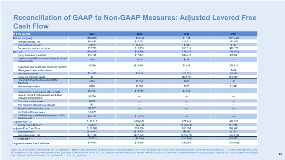 Reconciliation of GAAP to Non-GAAP Measures: Adjusted Levered Free Cash Flow In $ thousands 2024 2023 2022 2021 Net income (loss) ($98,696) ($6,443) $1,101 ($51,440) $44,426 $37,122 $11,212 $23,545 Interest expense, net Income taxes (benefit) ($342) $1,034 $488 $783 $17,713 $16,883 $15,315 $10,172 Depreciation and amortization EBITDA ($36,899) $48,596 $28,116 ($16,940) $15,465 $17,997 $29,044 $9,699 Equity-based compensation Employer payroll taxes related to equity-based $436 $672 $123 — compensation $8,886 ($18,464) $2,438 $26,618 Acquisition and transaction expenses (income) — — — $462 Management fees and expenses $32,575 $6,839 $10,301 $8,312 Litigation expenses $0 — ($2,597) ($2,269) Employee retention credit Financial transaction fees and related $620 $9,038 $836 $0 expenses $998 $3,193 $523 $1,441 TRA remeasurement $62,551 $16,750 $3,656 — Impairment of goodwill and other assets Loss on brand divestitures and wind down $1,820 — — — (excluding impairments) $690 — — — Executive transition costs $331 — — — Non-recurring rebranding expenses $1,287 — — — Transformation initiative costs $1,170 — — — Contract settlement costs Restructuring and related charges (excluding $26,287 $15,700 — — impairments) $116,217 $100,321 $72,440 $27,323 Adjusted EBITDA (1) ($6,528) ($9,213) ($16,132) ($4,858) Capital expenditures Adjusted Free Cash Flow $109,689 $91,108 $56,308 $22,465 (2) ($10,841) ($14,438) ($882) ($783) Tax payments Interest expense, net ($44,426) ($37,122) ($11,212) ($23,545) (3) ($5,772) ($7,092) ($16,250) ($8,992) Dividends $48,650 $32,456 $27,964 ($10,855) Adjusted Levered Free Cash Flow Note: We define capital expenditures as: (i) purchases of property and equipment and purchases of intangible assets which are included in cash flows from investing activities. We define tax payments as: (i) income taxes (benefit), and (ii) payments for tax receivable agreement and payments for distributions to Pre-IPO LLC Members which are included in cash flows from financing activities. We define dividends as: (i) payment of preferred stock dividend and deemed 63 cash dividend which are included in cash flows from financing activities.