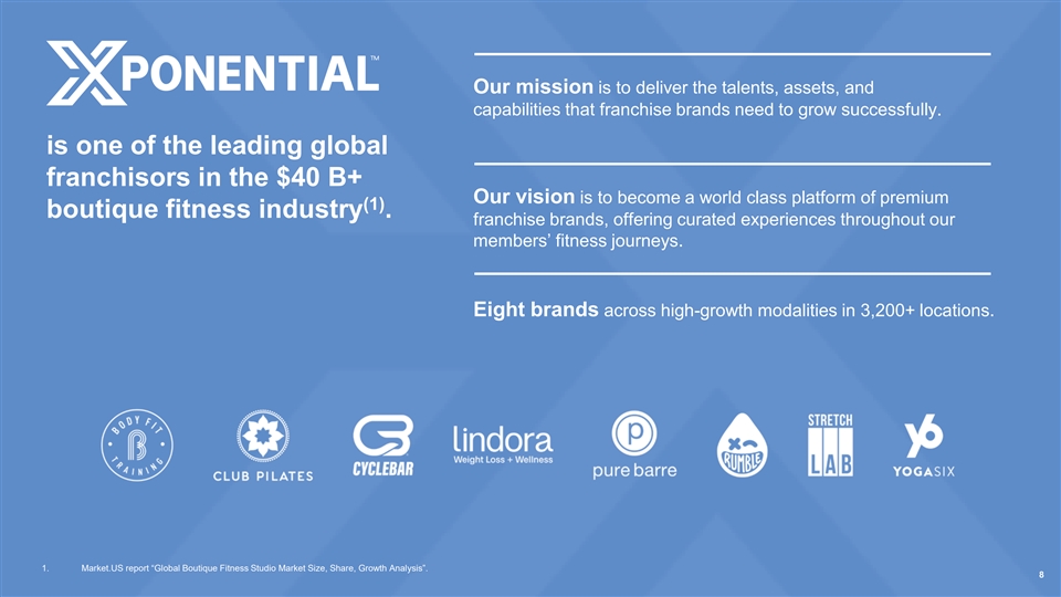 Our mission is to deliver the talents, assets, and capabilities that franchise brands need to grow successfully. is one of the leading global franchisors in the $40 B+ Our vision is to become a world class platform of premium (1) boutique fitness industry . franchise brands, offering curated experiences throughout our members’ fitness journeys. Eight brands across high-growth modalities in 3,200+ locations. 1. Market.US report “Global Boutique Fitness Studio Market Size, Share, Growth Analysis”. 8